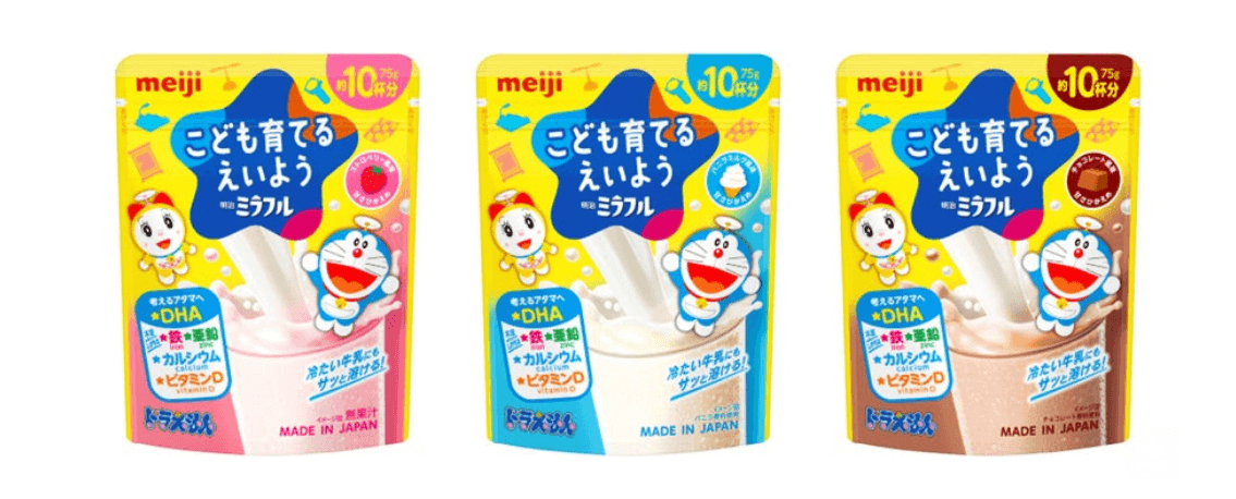 明治 Milafuru《哆啦A夢》設計包裝 粉末飲品系列(草莓、香草、巧克力風味/各540日圓/含稅)(株式会社 明治)