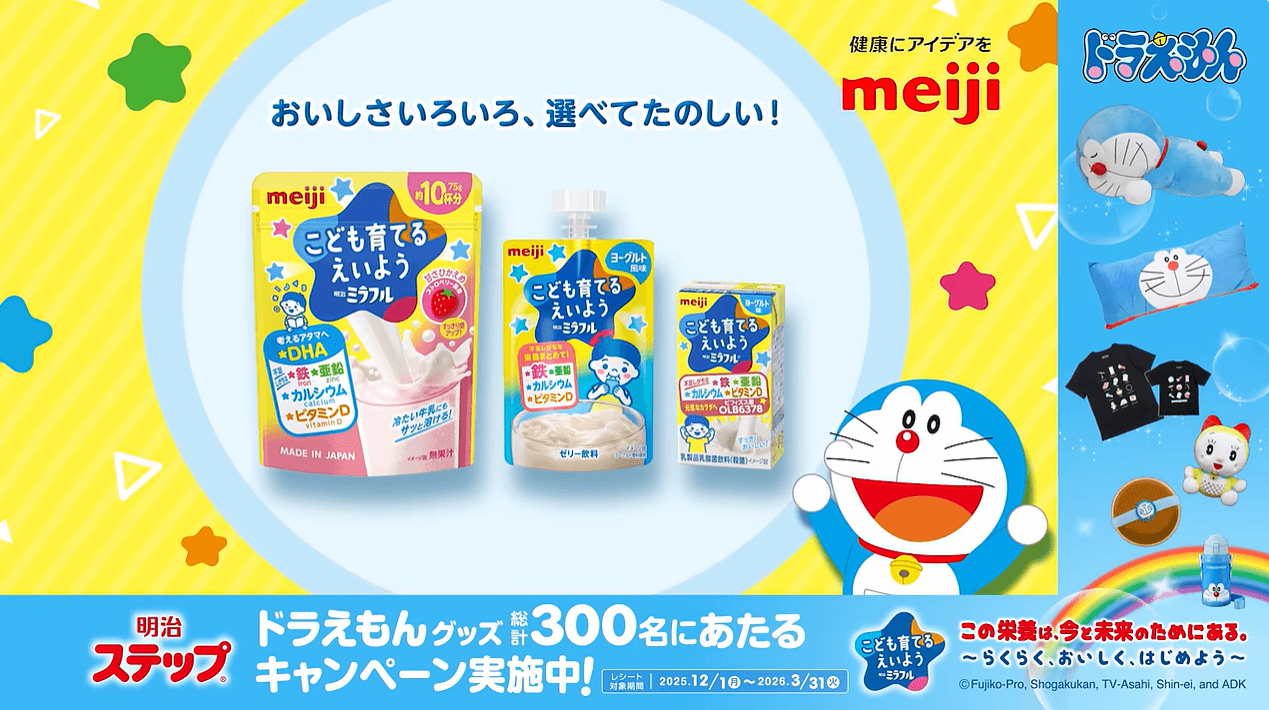 本次合作以「為孩子的現在與未來補足關鍵營養」為核心主題,除了推出多款《哆啦A夢》限定設計的包裝外,日本也同步舉辦抽獎活動。凡購買指定商品並憑購買憑證參加活動,即有機會獲得「哆啦A夢周邊商品」。