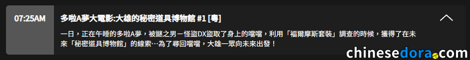 《電影多啦A夢:大雄的秘密法寶博物館》於 2025 年 12 月 6 日在 SUPER Kids Channel 播出,使用標題包含「多啦A夢大電影」一語。本圖片截取自節目表,為該播放日的首次播映。(資料圖片,myTV SUPER 網頁版截圖)