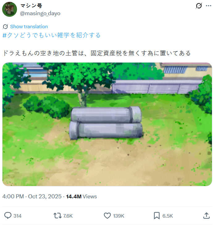 至於不少網友關心的「放置水泥管會不會讓稅變便宜」的說法,專家明確指出:完全不會。固定資產稅的減免多適用於住宅用地等特例,空地上僅放置土管或雜物,並不構成建築物,無法享受任何減免。即便被視為「資材置放場」,也同樣不符合優惠條件。也有推特網友說「土管其實是下水道工程頻繁進行的昭和時代常見風景呢。我老家直到平成時代才「終於」開始做下水道工程,但那時候資材堆放場早就已經變成小孩不能隨便進去的地方了。」(而且空地被圍起來的時候,大雄他們還是偷跑進去玩)