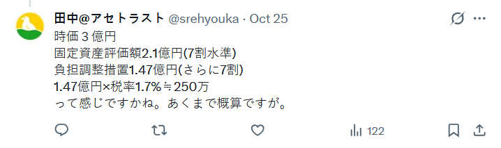從事日本不動產事務的推特網友以《哆啦A夢》昭和時代的背景計算,空地市價約 3 億日圓,固定資產評價額約 2.1 億日圓(約為市價的 7 成),再套用負擔調整措施後約為 1.47 億日圓(再打 7 折),1.47 億日圓 × 稅率 1.7% ≒ 約等於 250 萬日圓。