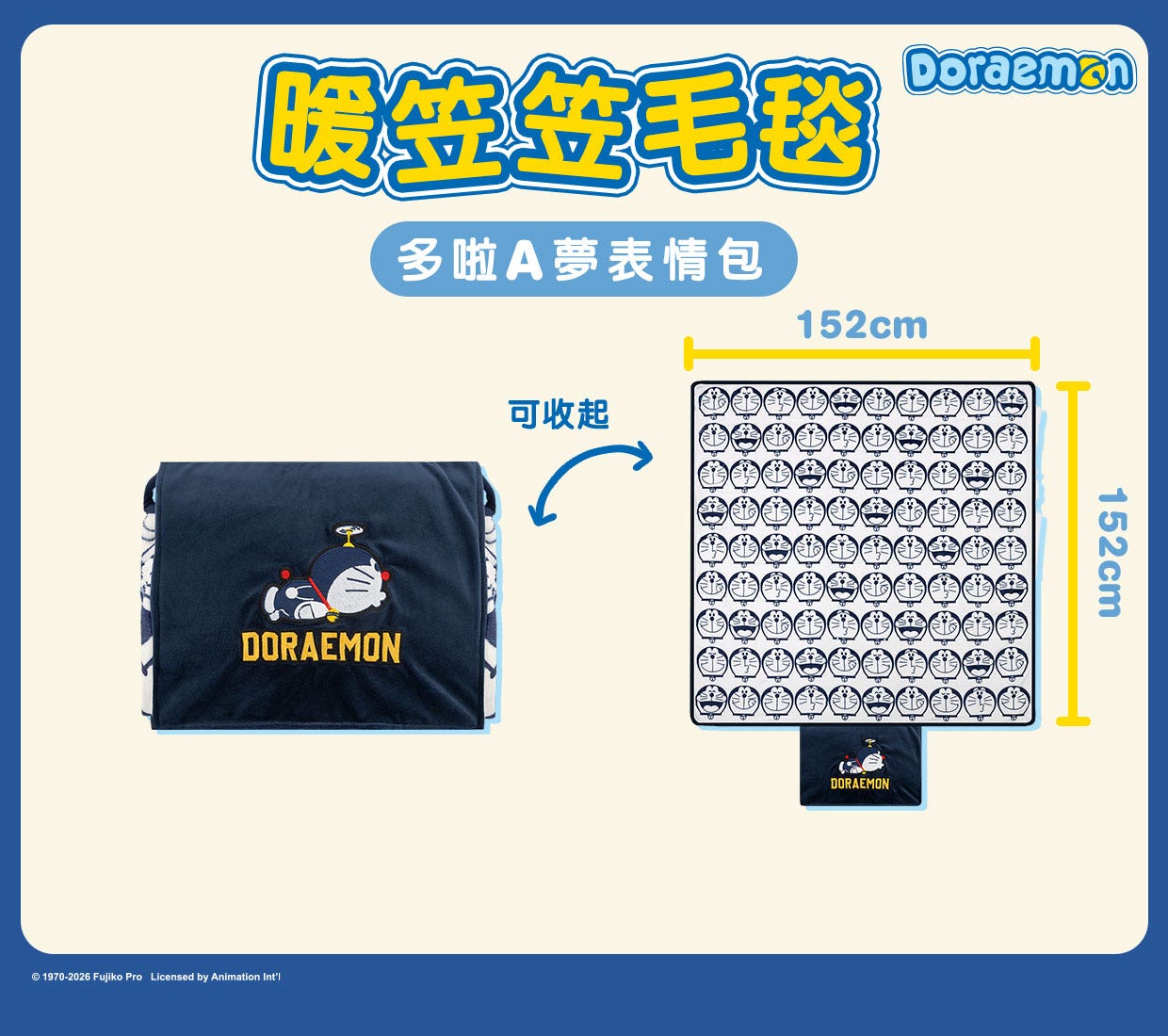 適逢天氣轉涼,今次也特別推出了一款集合多啦A夢療癒及鬼馬表情包的可摺疊毛毯,在家保暖非常實用。