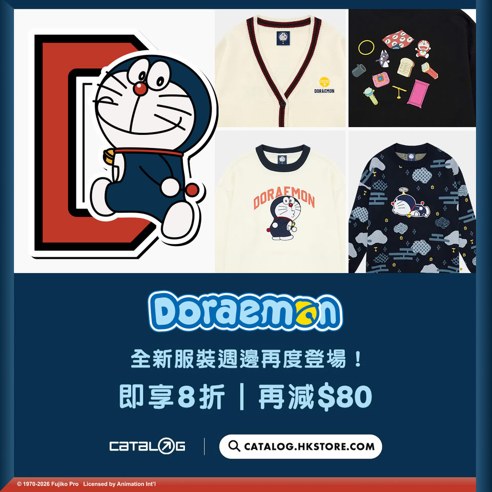 Catalog 與多啦A夢合作推出的全新系列,第一彈「日常系列」現已上市,有法寶刺繡盲盒及各種服裝週邊。新年買新衫必「發」、置物百寶袋,現在門市或網店買任何聯名商品都有優惠,可享低至八折!