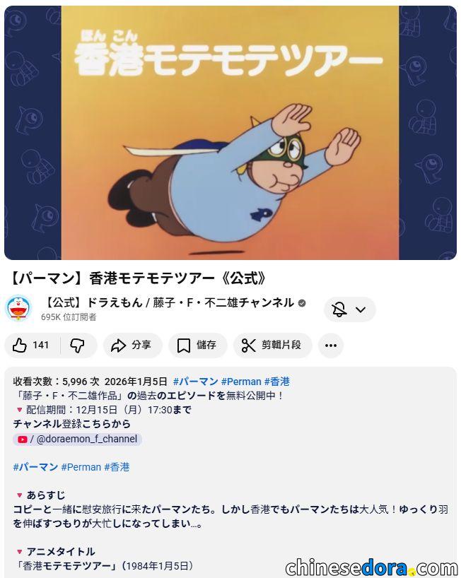《多啦A夢(香港譯名)/哆啦A夢(台灣譯名)》等藤子.F.不二雄作品的日本 YouTube 官方頻道(【公式】ドラえもん / 藤子・F・不二雄チャンネル)近期持續固定更新,挑選過往動畫集數、提供限時免費重溫。