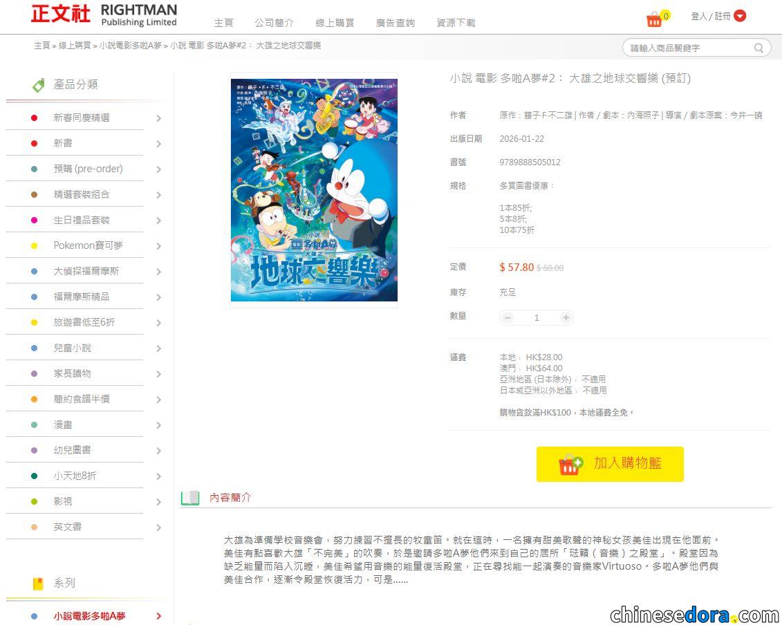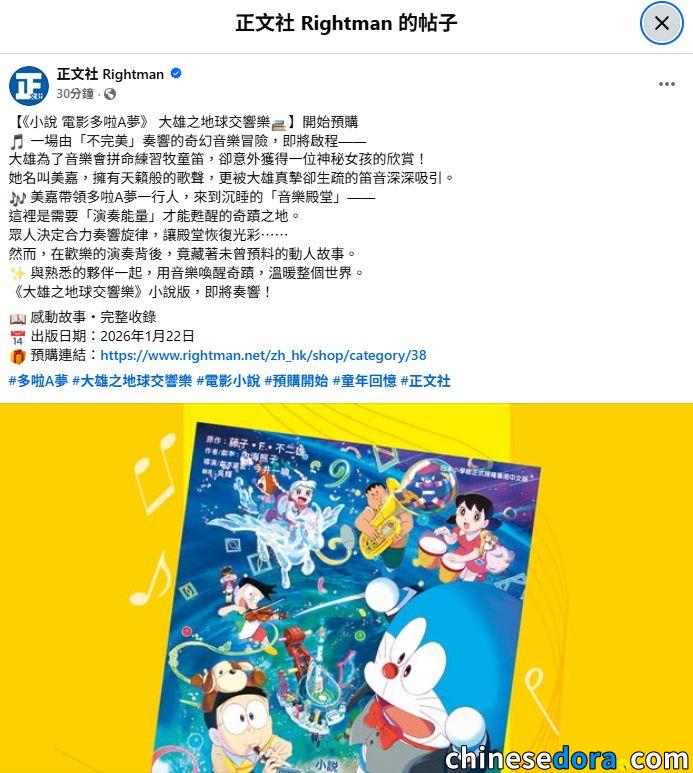 香港正文社確定推出《大雄之地球交響樂》的電影小說,預計 1 月 22 日出版,現已開放預購。