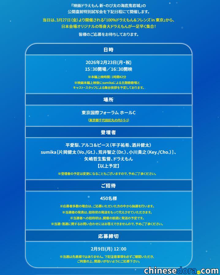 2 月 23 日在東京國際論壇會舉辦一場《新.大雄的海底鬼岩城》特別試映會(15:30開場/16:30開映),一共會抽出 450 名幸運兒參與,可在 2 月 9 日中午 12 時(日本時間)前登記抽選