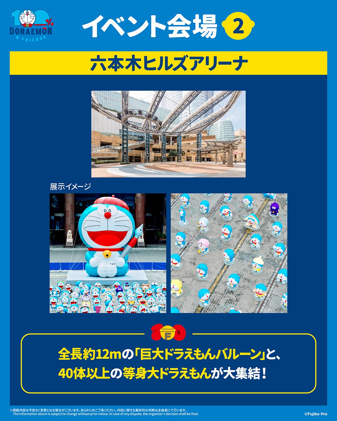 在六本木亮相的是約 12 公尺/米高巨型氣球以及超過 40 款不同表情姿勢的哆啦A夢雕塑。大批新雕塑列陣,首次登陸電視台舉辦年度暑期活動的六本木之丘,定必會呈現新穎且壯觀的景象!