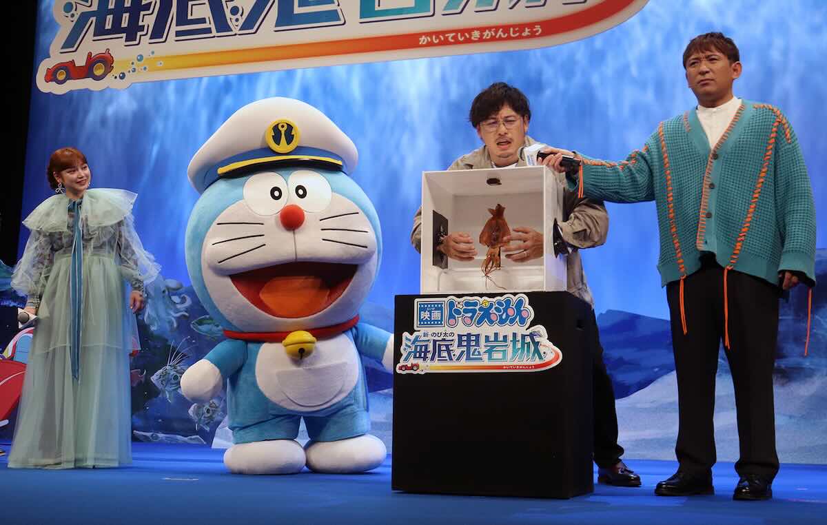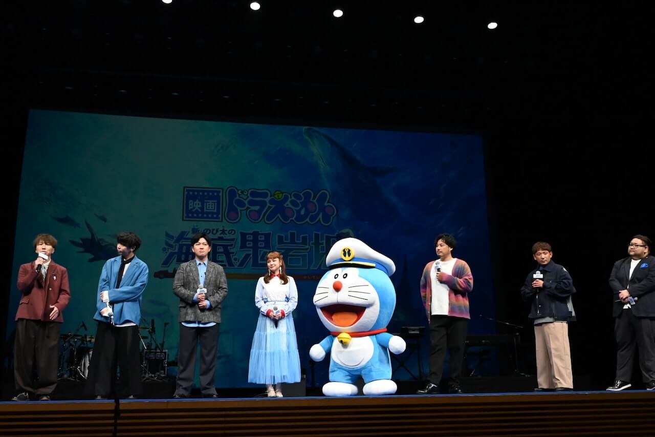 隨後哆啦A夢人偶與來賓在舞台登場,談到「感受到哆啦A夢影響力的瞬間」,平愛梨表示,當她向親友報告確定替電影配音時,眾人反應相當熱烈;隨著上映日逐漸逼近,她更發現哆啦A夢與各種品牌、企劃合作頻繁,讓她再次體會到這個國民動畫角色的偉大與影響力。她看完電影後,覺得片中描繪的海底世界相當美麗,想去體驗看看水肺潛水。