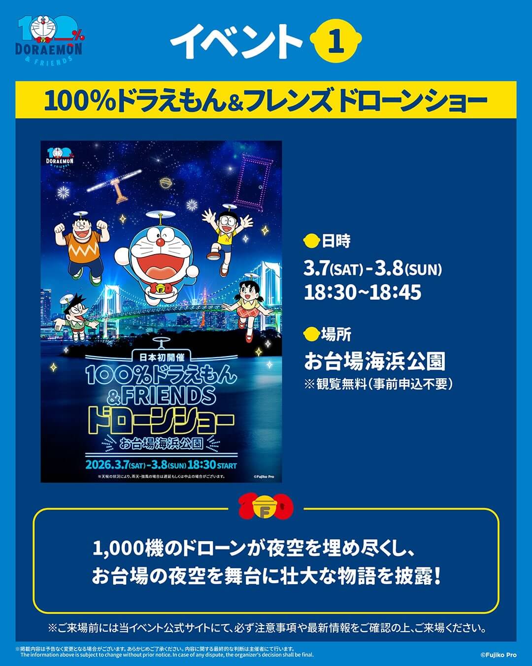 在主展覽開幕前,東京多處地點將率先舉辦慶祝活動。「100% DORAEMON & FRIENDS 無人機匯演」於 2026 年 3 月 7 日至 8 日在台場海濱公園舉行,每日 18:30 至 18:45,將有 1000 架無人機在夜空中展示與哆啦A夢相關的壯觀圖案。