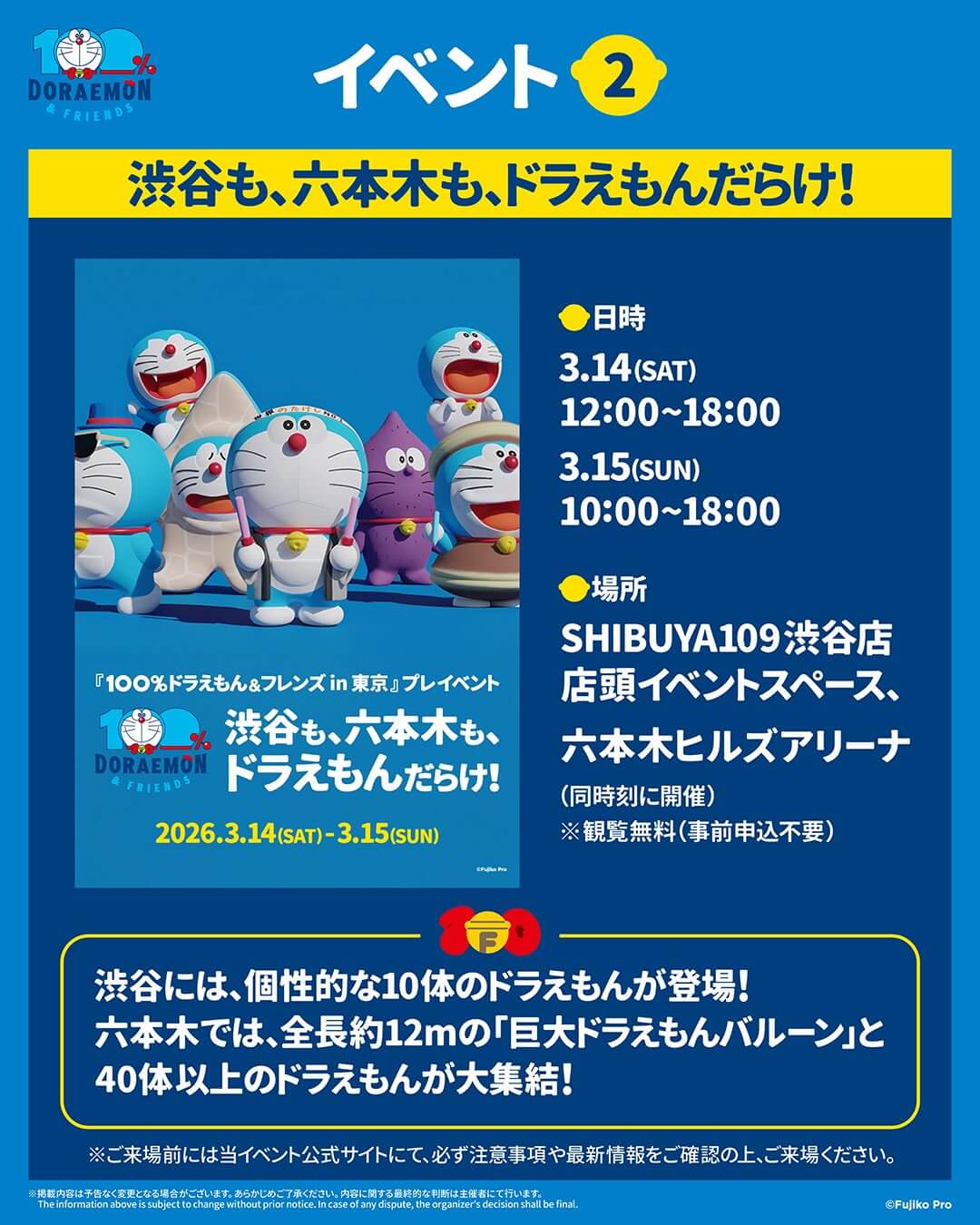 與香港、台北等站的模式不同,東京哆啦A夢雕塑快閃分為兩個地點:3 月 14 日至 15 日在 SHIBUYA109 澀谷店店面廣場,展示 10 尊具備不同特徵的哆啦A夢雕塑。