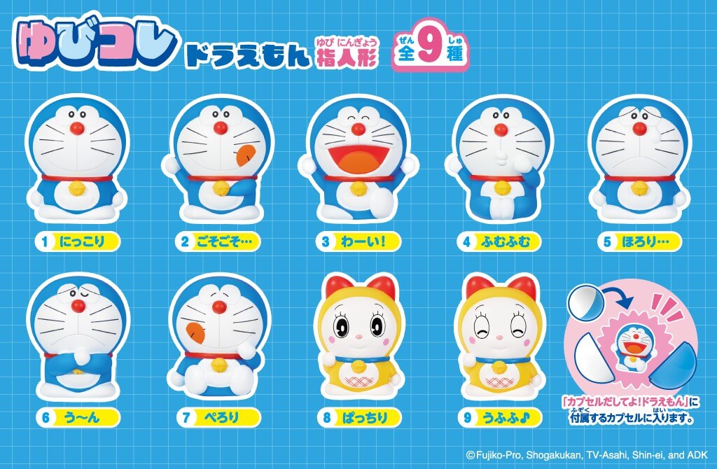 「手指公仔 哆啦A夢」為表情豐富的哆啦A夢與哆啦美(港:多啦美)指偶公仔系列,共 9 種款式,採隨機盲盒形式販售。