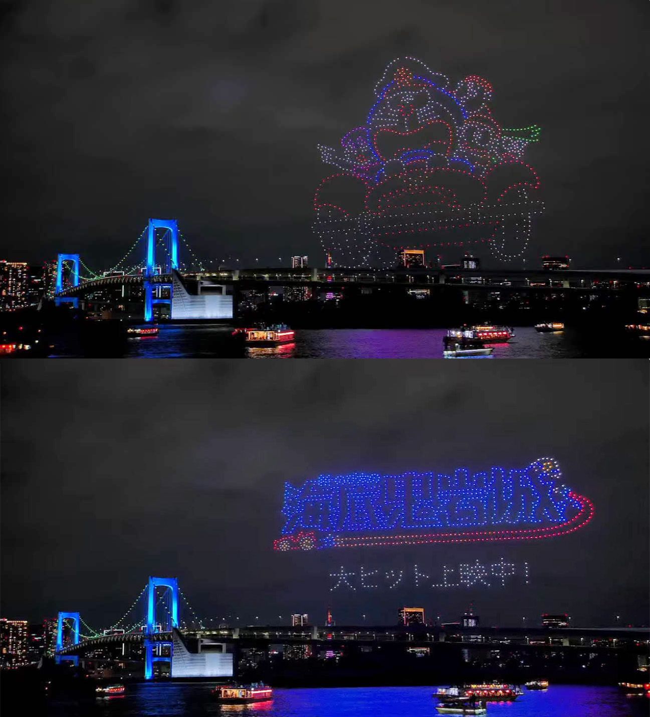 這次日本的無人機匯演頭半部分內容把香港兩場的畫面精選再現,尾半段加入日本展場限定及電影相關的元素。演出過程有背景音樂,還有日本五位主角聲優的角色對話。