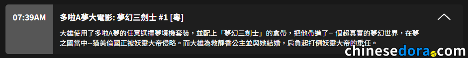 ※以上節目時段來自 myTV SUPER 網頁版的節目表。節目「開播時間」的部分以《多啦A夢》節目的開始時間作標記,「結束時間」的部分列出下一節目的開始時間以作參考。