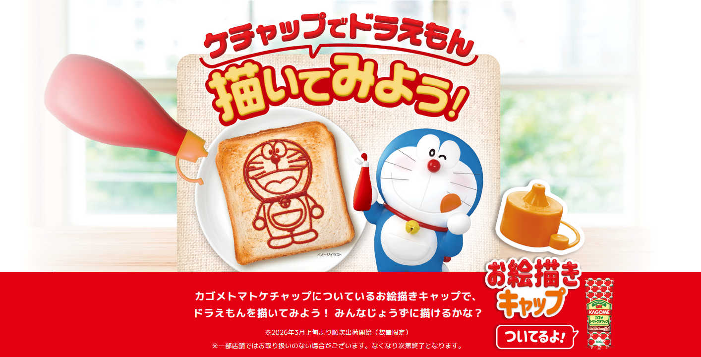 此外,還將推出附有「哆啦A夢繪圖蓋」的特別商品,讓消費者能用番茄醬直接在料理上畫出角色造型,並搭配「畫哆啦A夢(ドラえもん・えかきうた)」歌曲教學影片,打造親子同樂的用餐體驗。
