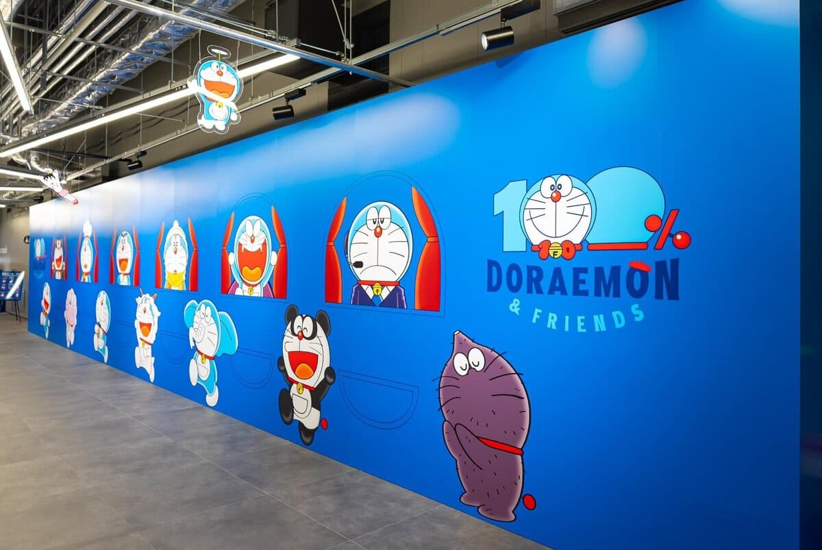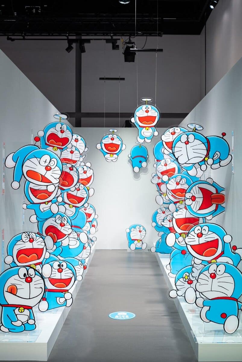 這次開幕的「100% DORAEMON & FRIENDS」東京站是展覽巡迴的第 8 個地點,在進入展覽前有一條集合精選及一些海外巡迴造型圖案的走廊。