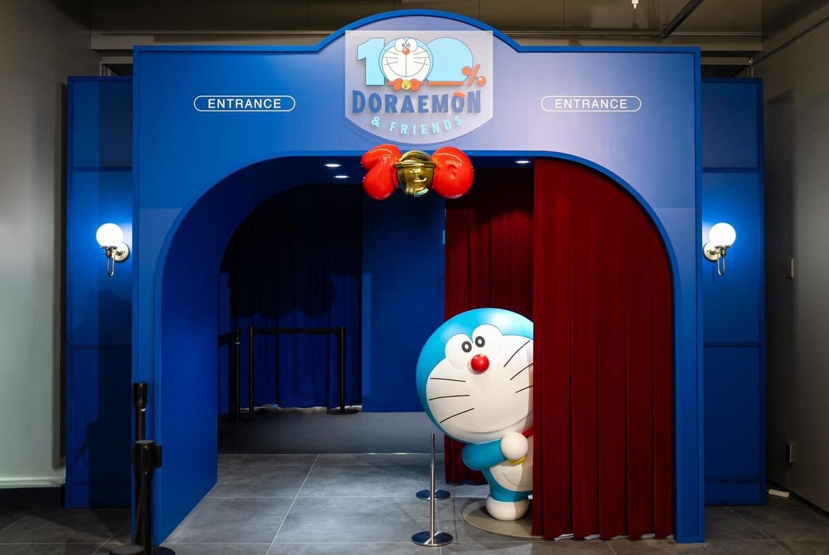 展覽場地還原海外各站的佈置,從首個收費展區「動漫藝術展覽廳」開始參觀旅程,在入口處就會見到從劇院布幕探頭出來的哆啦A夢/多啦A夢。