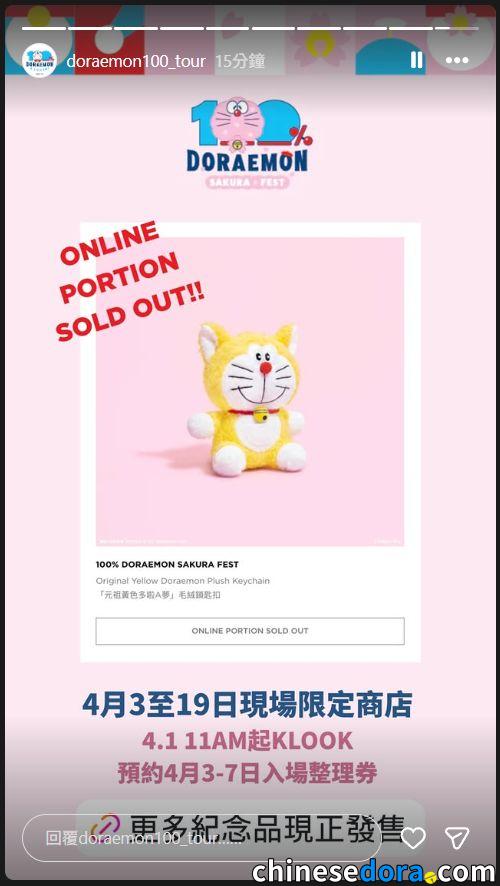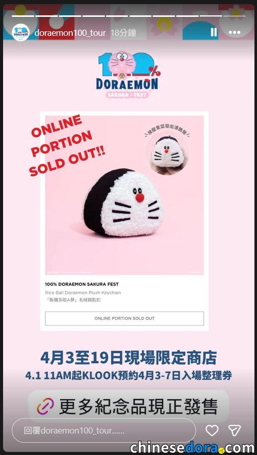 主辦單位從展覽與活動特設的社交平台帳號發佈限時動態,公佈紀念品網上售罄的消息。(資料圖片,Doraemon 100)