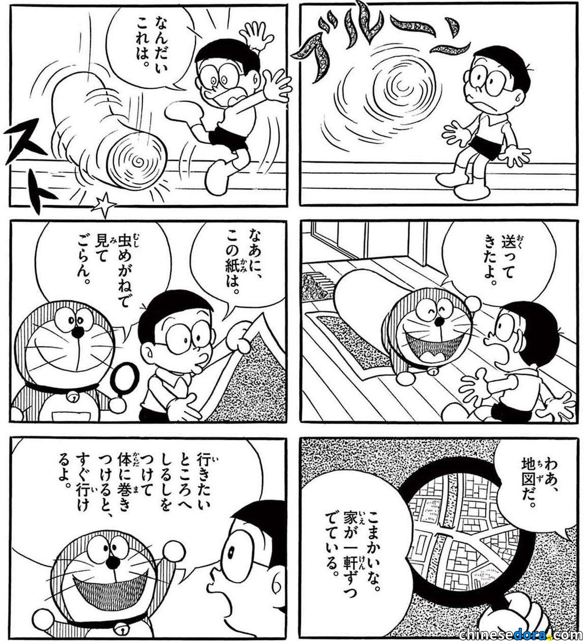 「魔法地圖」可以做到空間轉移,只要在地圖上加上記號,用地圖捲著身體,就可以馬上到達標記上的地方,相當於一瞬間就可以環遊世界各地。然而,這個功能很容易讓人聯想到經典的「任意門/隨意門」,不過「任意門/隨意門」其實是在 1973 年連載的故事才登場並在其後命名,比「魔法地圖」還要晚 2 年。