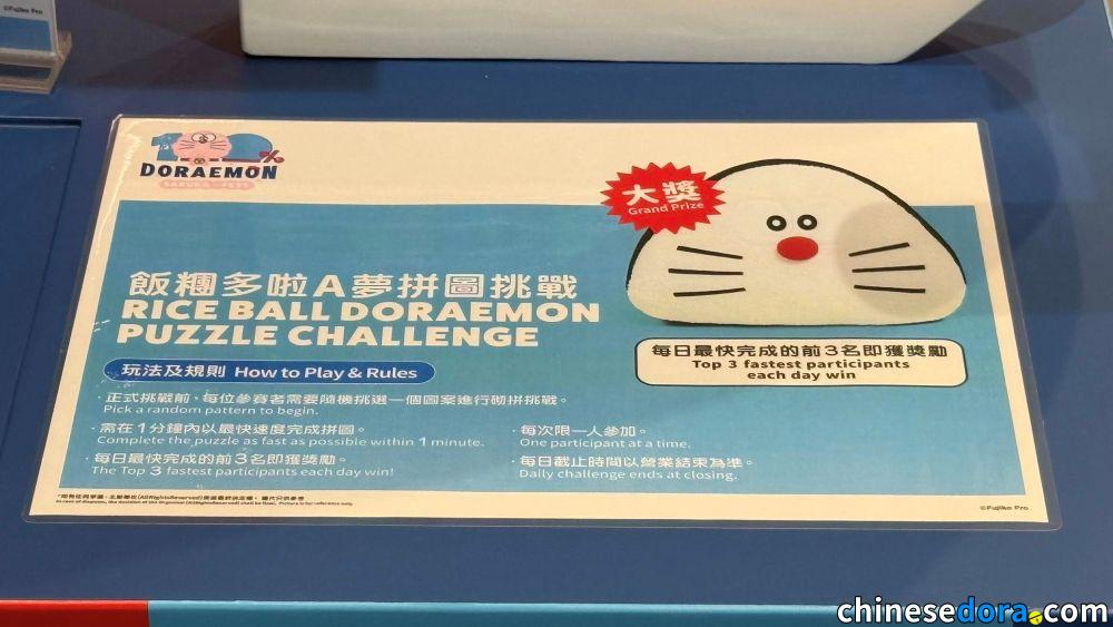 「拋波樂」把球拋進指定顏色的洞口可以分別贏取細中大獎,港幣 50 元有 10 球、100 元有 20 球、150 元有 33 球。「飯糰多啦A夢拼圖挑戰」要在挑戰前隨機挑選圖案拼砌,並在一分鐘內用最快速度完成,每日前三名就可以獲得獎品。