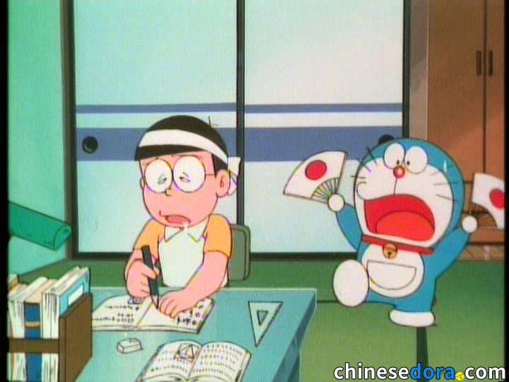 圖片中,哆啦A夢/多啦A夢、胖虎、小夫、靜香和其他同學都換上應援團造型,戴著頭巾、手上揮動扇子及螢光棒,為台上的演唱者大雄打氣!