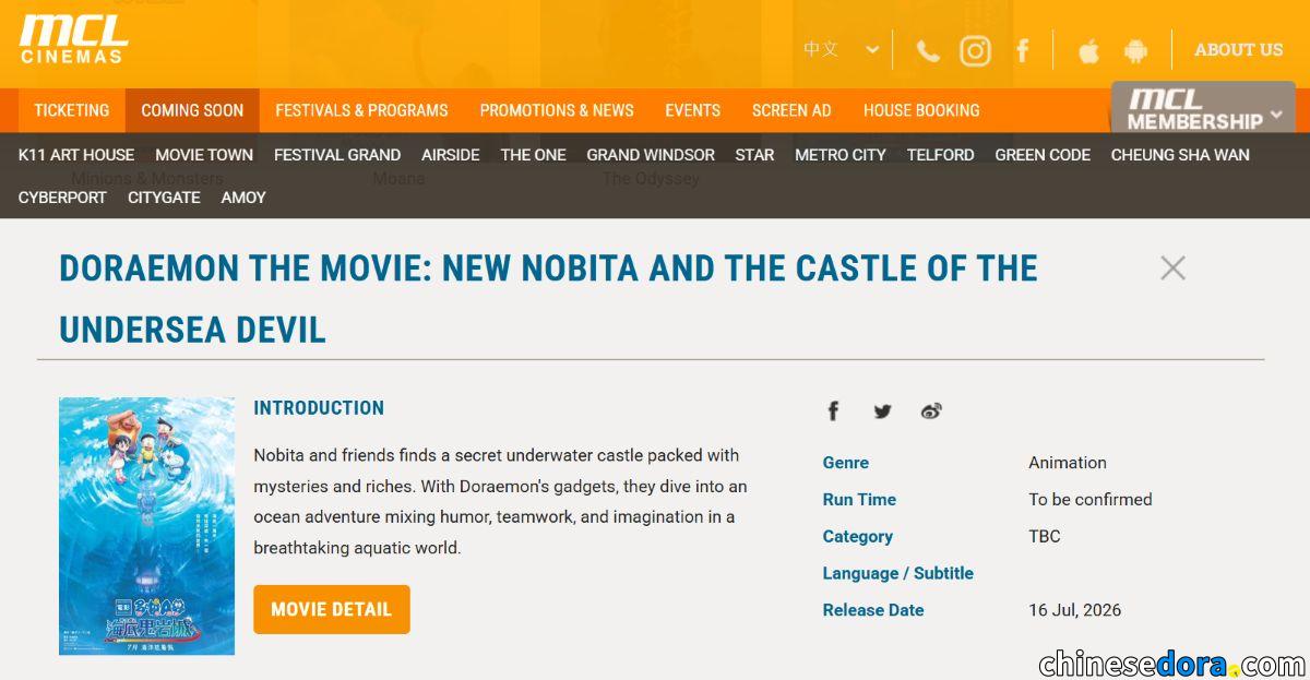 《電影多啦A夢:新・大雄之海底鬼岩城》上映消息在香港正式公開,日前在戲院網頁印搶先披露預計上映日期及劇情簡介!