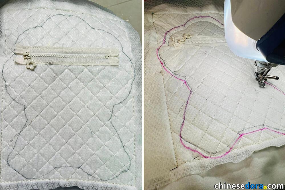 先是將抹手布背面拆解,將內層加入鋪棉強化厚度,再縫上拉鍊,最後依照角色外型輪廓,使用縫紉機車縫定型,兩側縫上金屬手工藝扣就完成了。