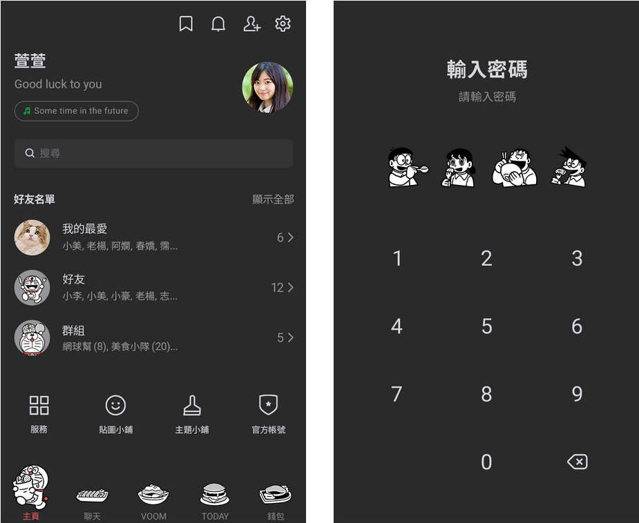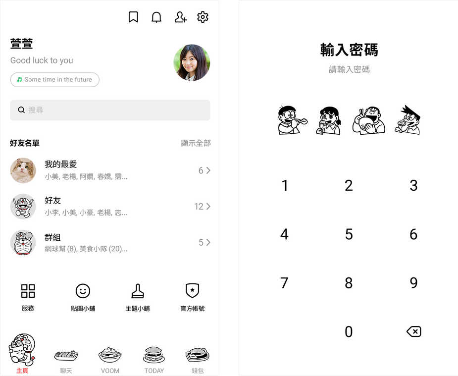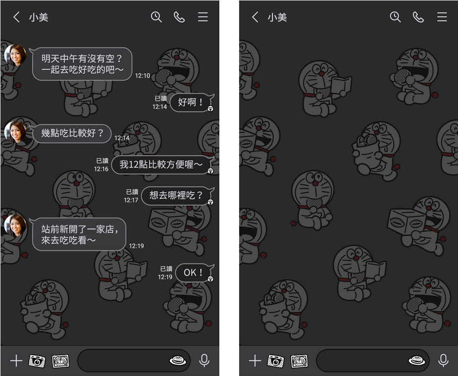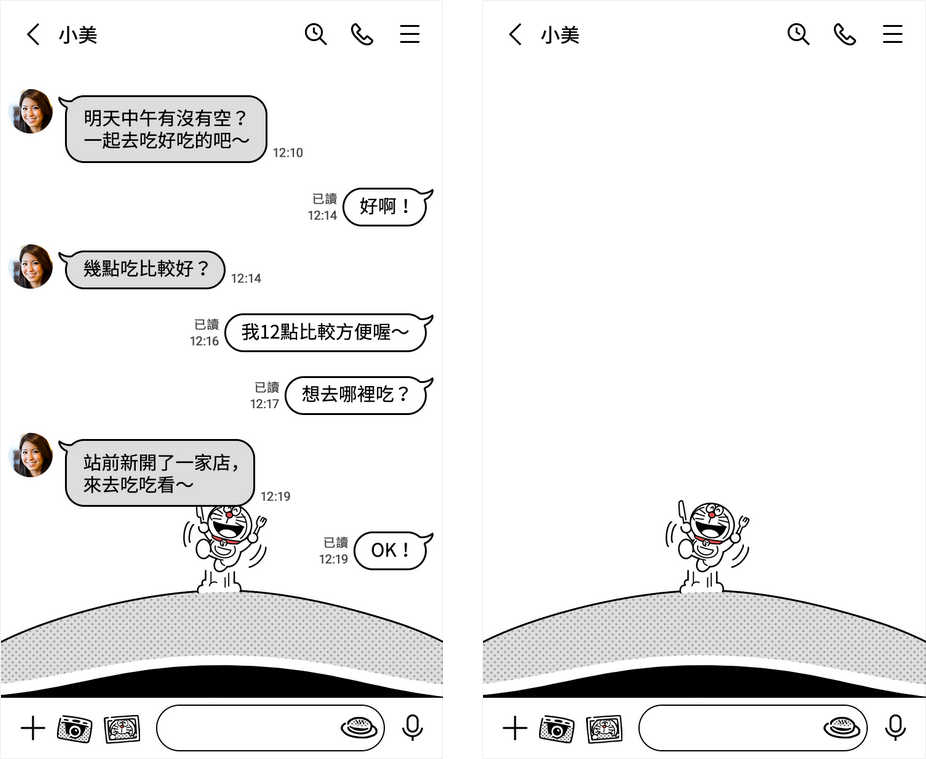 介面設計上,整體圖示與聊天背景皆維持一致的黑白配色,減少視覺干擾,提升閱讀舒適度。白色款清爽明亮,黑色款則更顯沉穩俐落,無論日常或夜間使用都相當合適,解鎖畫面也有大雄一行人一起享用美食的巧思圖案。