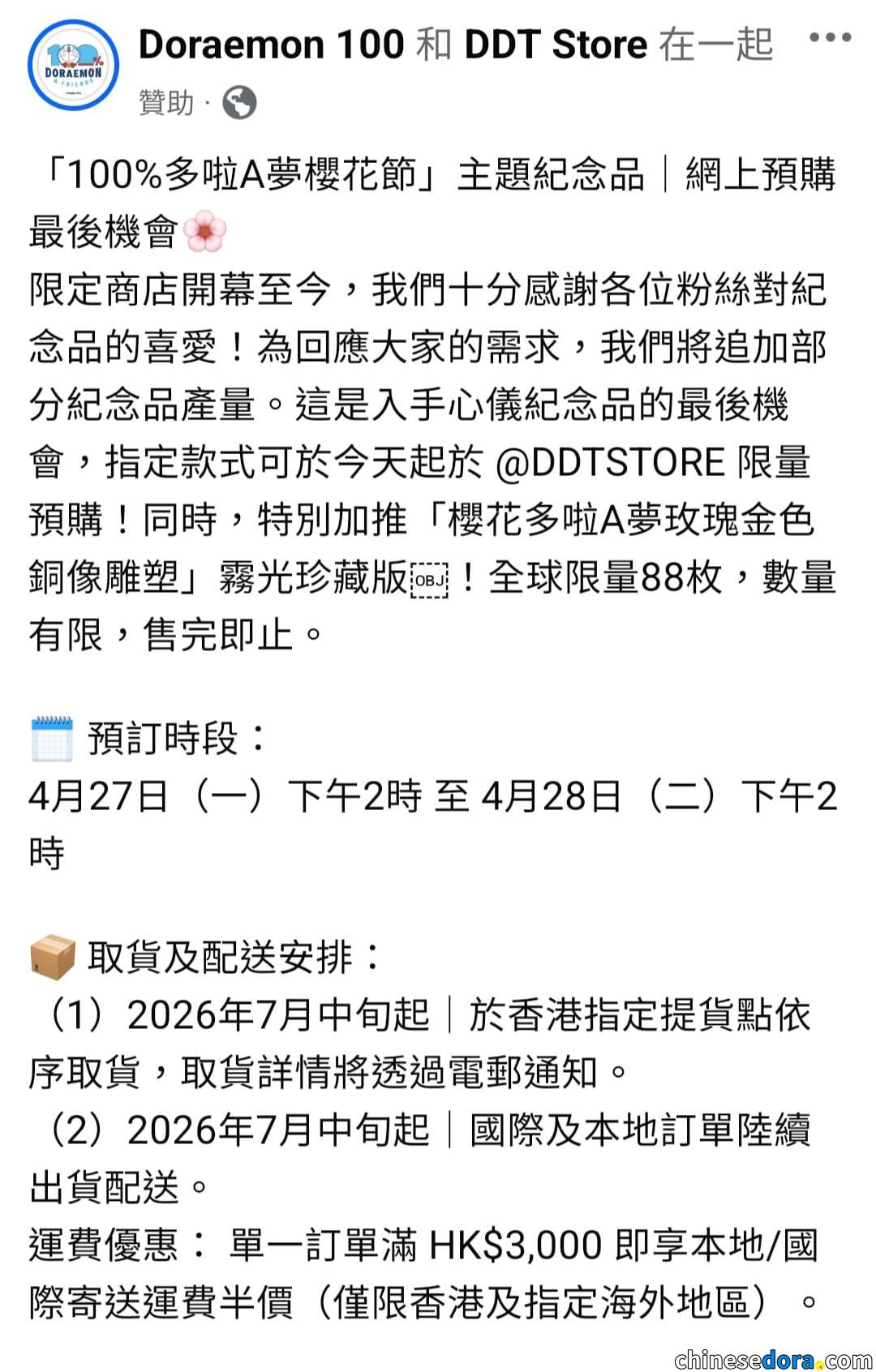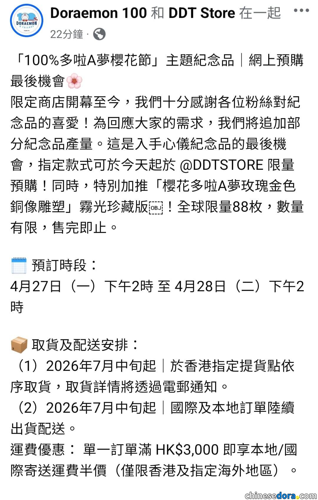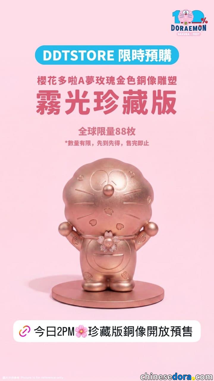 香港活動「100%多啦A夢櫻花節」大受歡迎,主辦方宣佈限時加開部分紀念品限時預購,並且特別推出限量「霧光珍藏版」玫瑰金銅像,4 月 27 日(今日)下午 2 時起陸續開賣!