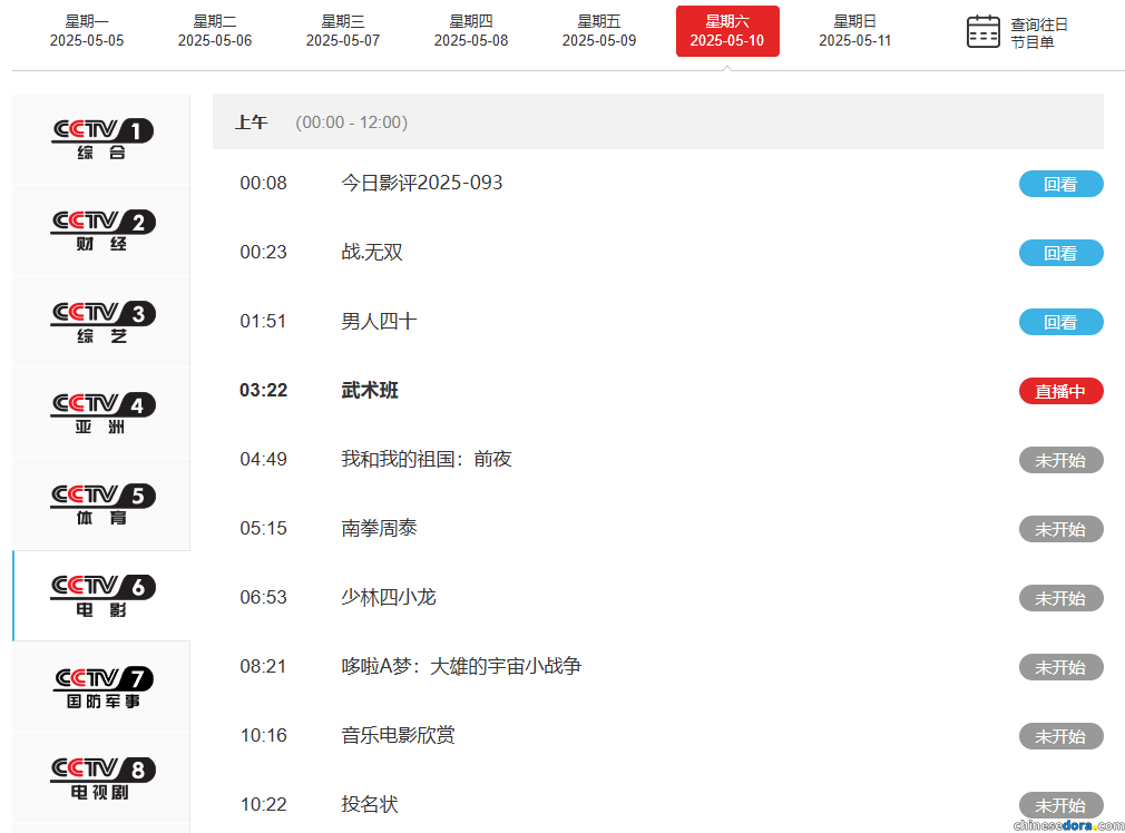 CCTV-6 電影頻道 2025 年 5 月 10 日節目表節錄。(資料圖片,CCTV節目官網截圖)