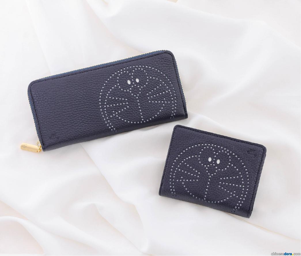 皮夾品牌「efffy」,推出海軍藍新色的長夾與雙折短夾,材質使用縮紋牛皮製作,上面有大大的哆啦A夢頭像,設計款式低調簡約。售價為 15400、13200 日圓。
