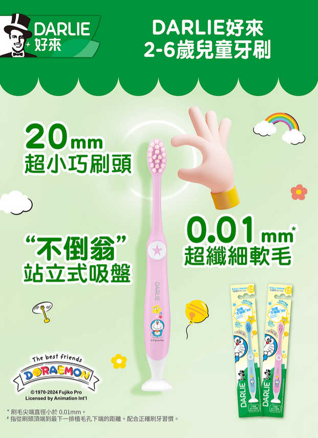 記者於家樂福(Carrefour)貨架上發現好來兒童系列的護齒套裝,外包裝與牙刷上都有哆啦A夢的超萌圖案!牙刷適用於2-6歲的學齡前兒童,底部設計為不倒翁站立式吸盤,粉藍與粉紅的顏色搭配,可愛滿點!