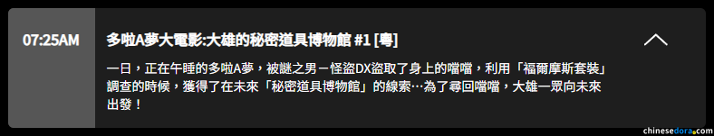 《電影多啦A夢:大雄的秘密法寶博物館》於 2025 年 6 月 28 日在 SUPER Kids Channel 播出,使用標題包含「多啦A夢大電影」一語。本圖片截取自節目表,為該播放日的首次播映。(資料圖片,myTV SUPER 網頁版截圖)