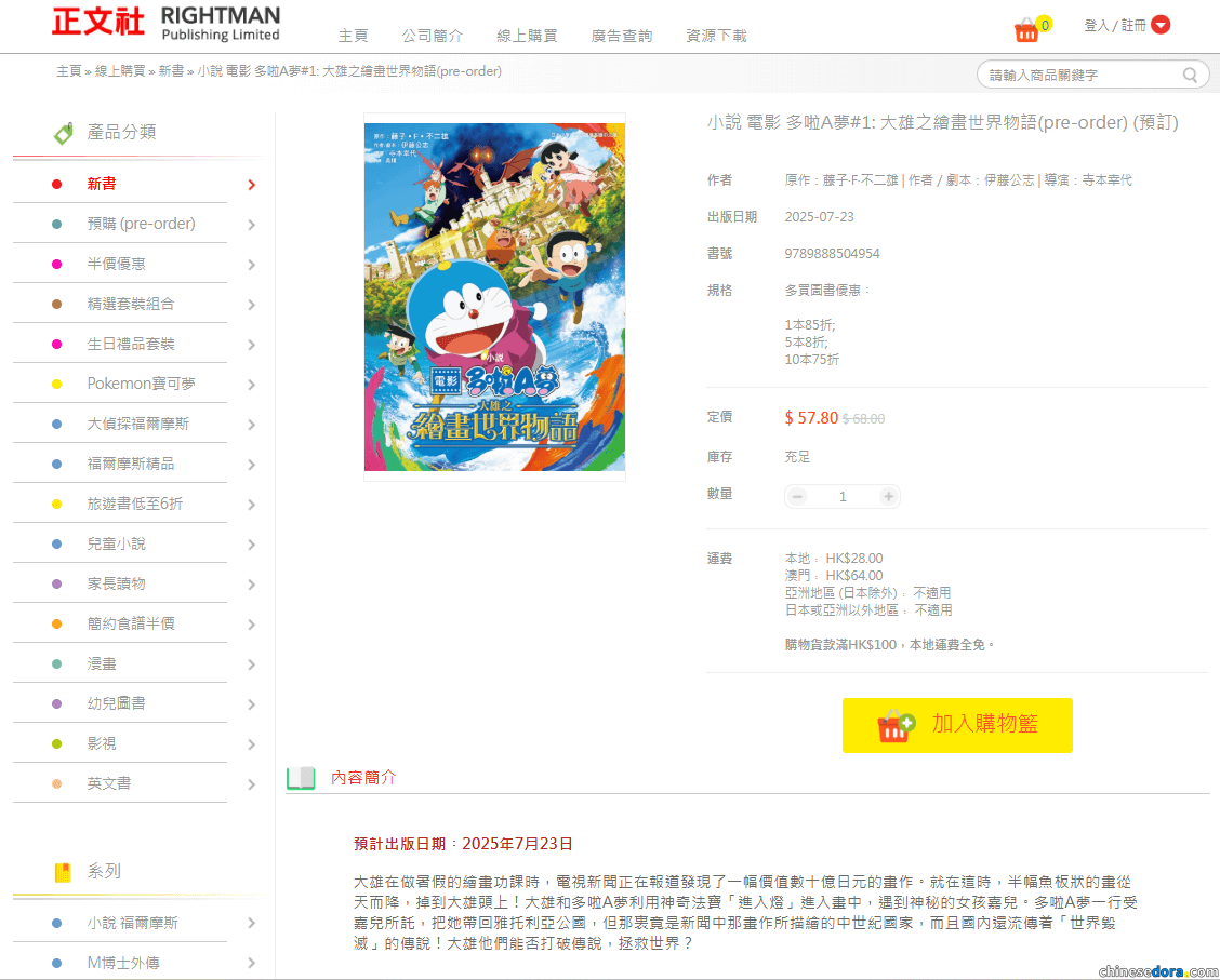 首本在香港出版的《多啦A夢》電影改編小說即將來了!最新作品《電影多啦A夢:大雄之繪畫世界物語》的小說版,現已在正文社網店接受預訂!