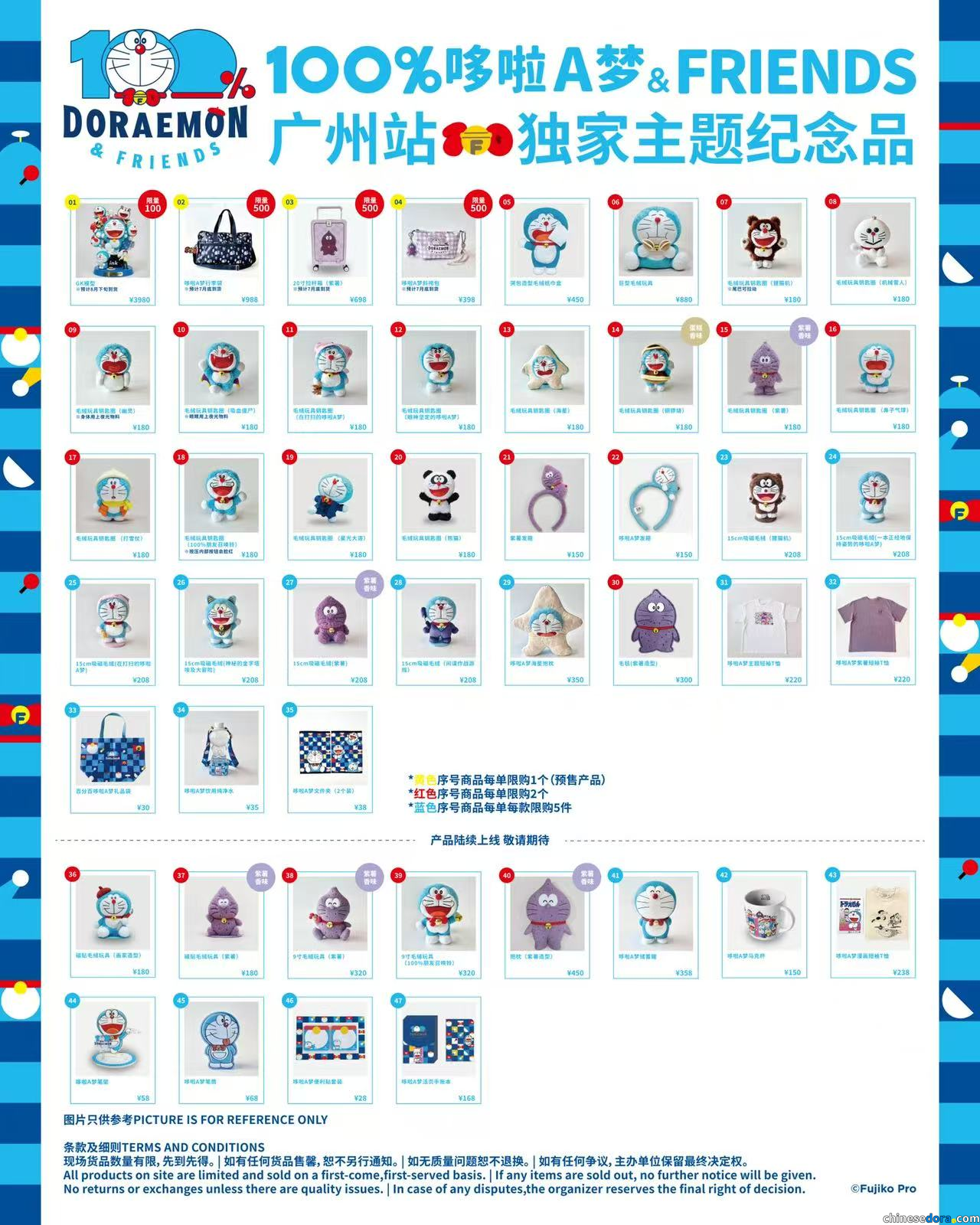 「100%哆啦A夢&FRIENDS」巡迴特展廣州站最初公佈全新及再版商品共有 35 款(扭蛋、拍貼機、聯名餐點等不算在內),而現場商店展示的資料版列表顯示了 47 種商品,當中 12 款特別註明會稍後上架(原字眼:產品陸續上線 敬請期待)。