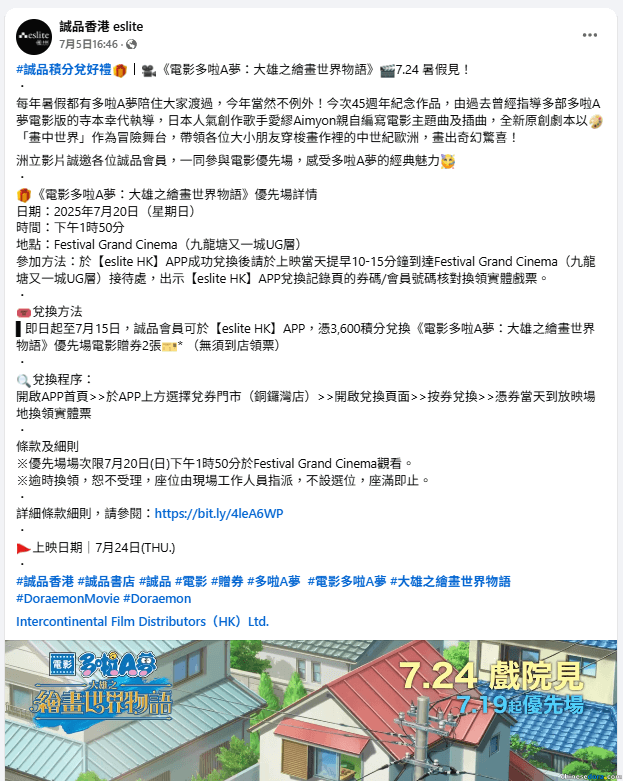 香港誠品舉辦「🎥 誠品請你看|《電影多啦A夢:大雄之繪畫世界物語》」換飛活動,誠品會員可以透過【誠品HK】APP,憑 3600 積分兌換優先場電影贈券一套兩張。活動截止日期,Facebook 帖文指為 7 月 15 日,網頁則寫至 7 月 16 日。