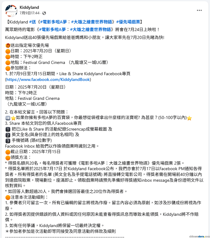 今年 Kiddyland 的《大雄之繪畫世界物語》贈票活動需留言回答多啦A夢或電影相關問題方可參與活動,而該帖文的問題為「你最想從多啦A夢的百寶袋裡拿出哪一個法寶及原因」。(資料圖片,Kiddylandy)