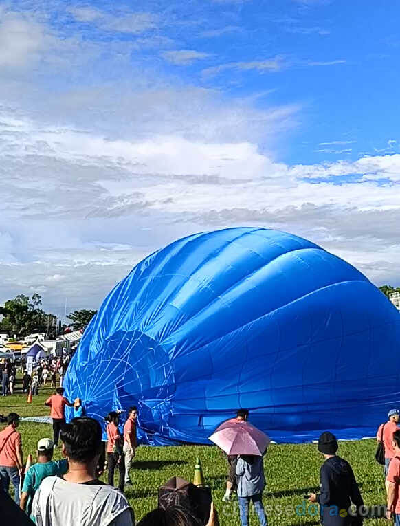 主持人介紹熱氣球充氣前,會將球皮展開檢查、飛行員會把籐籃倒下來,然後開始第一個步驟-冷膨脹:地勤人員使用藤籃前方的巨型風扇,將冷空氣灌入到球體當中,讓球皮可以撐起來。