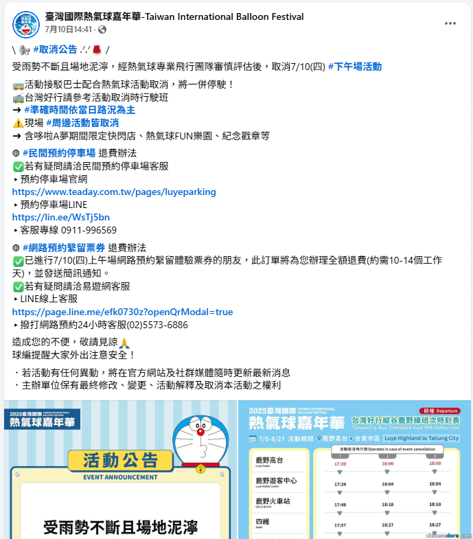 受雨勢不斷且場地泥濘,經過熱氣球專業飛行團隊審慎評估後,「2025台灣國際熱氣球嘉年華」原定 7 月 10 日下午的活動宣告取消。