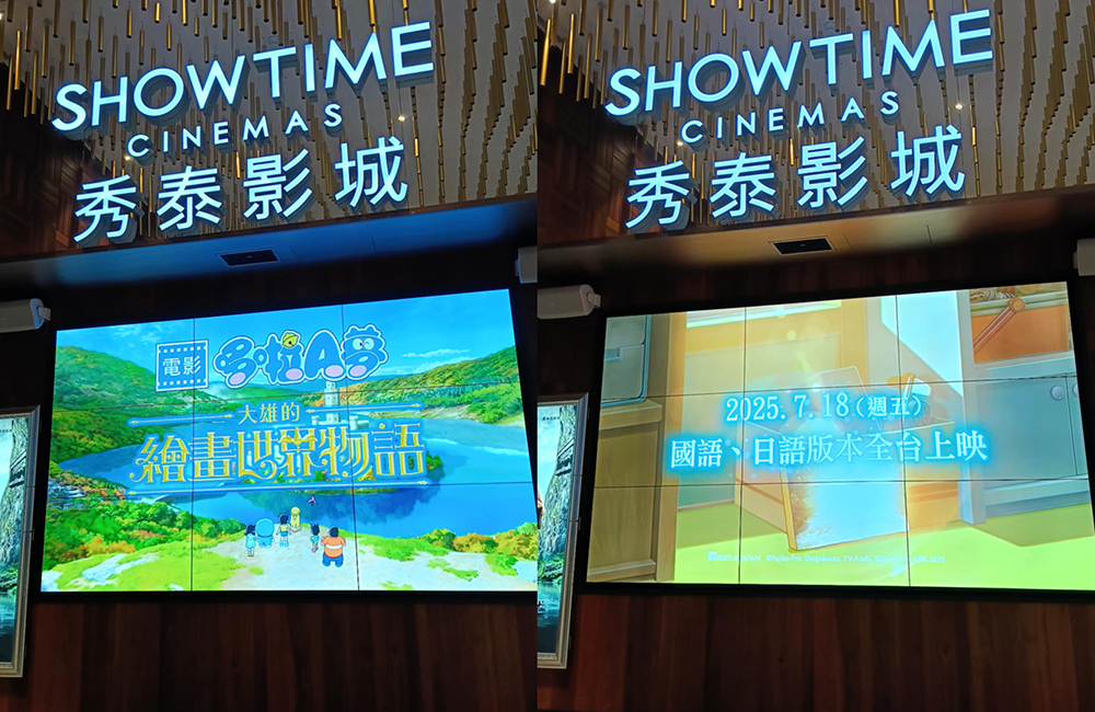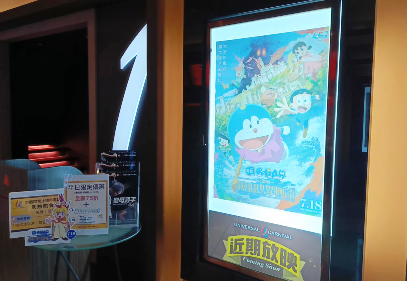 嘉義秀泰影城大廳擺設為今年電影特製拍照立座,就像進入畫中世界一樣!大廳的大螢幕上也開始播放電影《大雄的繪畫世界物語》的預告片了。