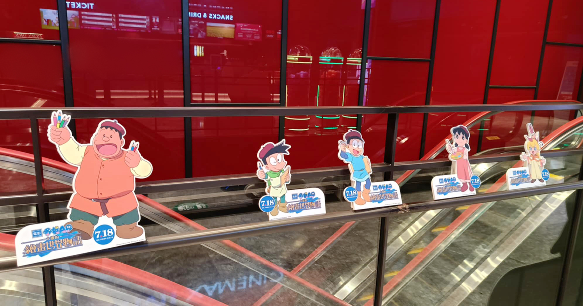 嘉義in89豪華影城入口大廳,擺放這一檔主打電影的海報立座,上樓去售票大廳,能看到哆啦A夢的立座與全部的人物小立牌。