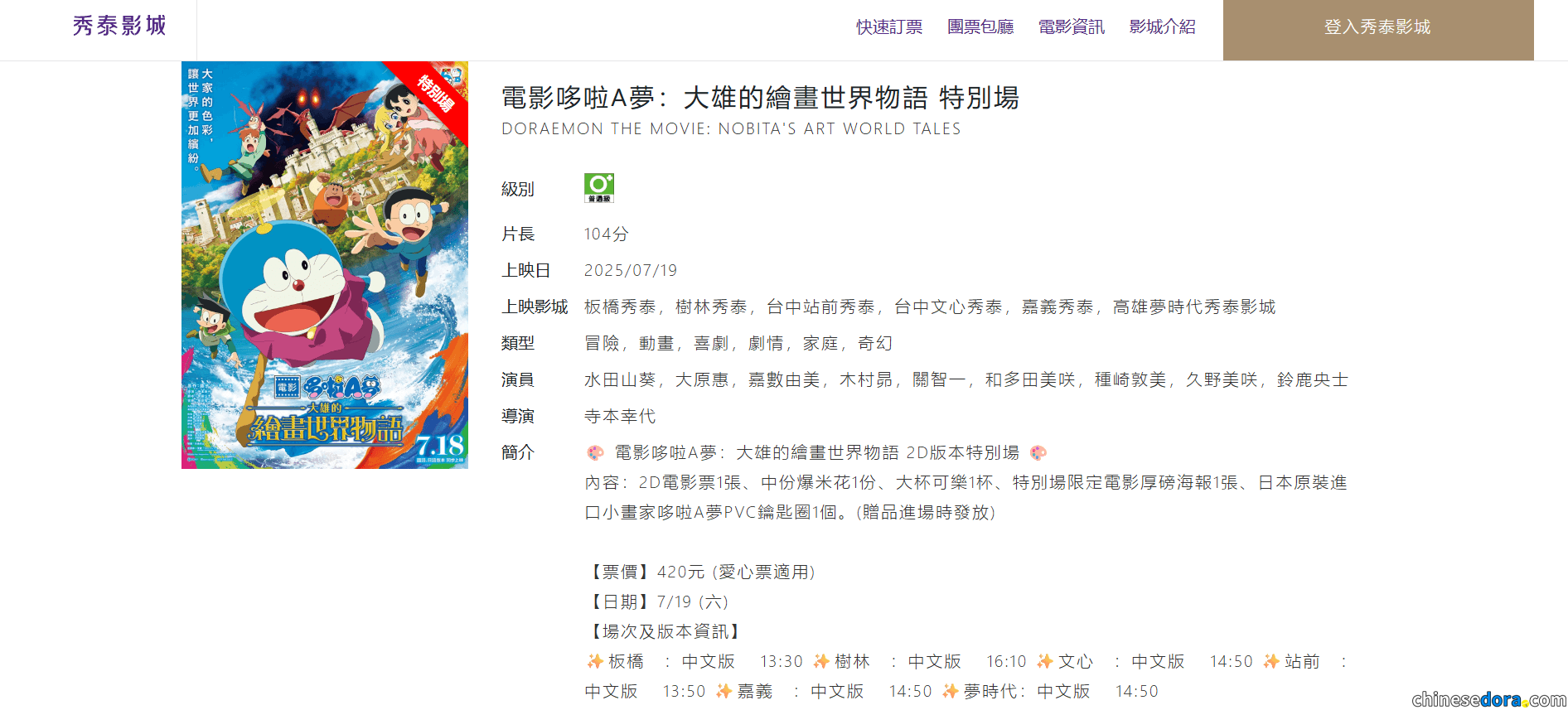 台灣秀泰影城推出《電影哆啦A夢:大雄的繪畫世界物語》冒險特別場,於板橋、樹林、文心、站前、嘉義、夢時代的秀泰影城舉辦。