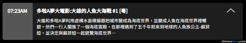 ※以上節目時段來自 myTV SUPER 網頁版的節目表。節目「開播時間」的部分以《多啦A夢》節目的開始時間作標記,「結束時間」的部分列出下一節目的開始時間以作參考。