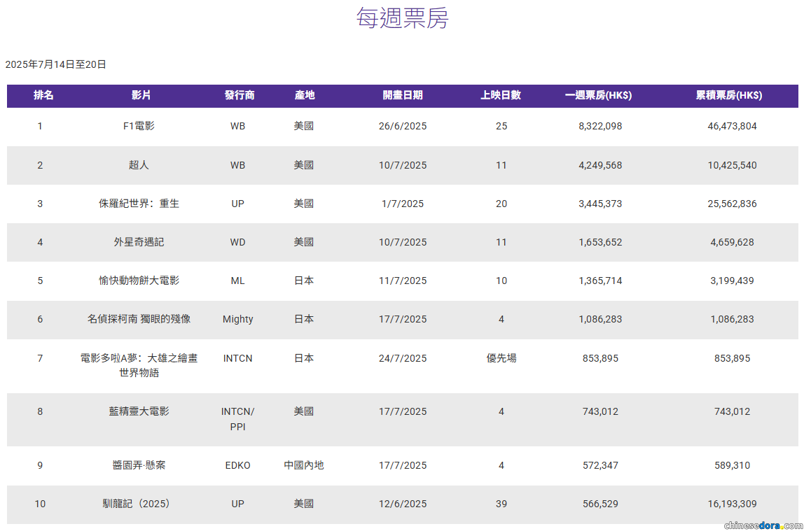 2025 年 7 月 14 日至 7 月 20 日香港電影票房。(資料圖片,HKTDC 截圖)