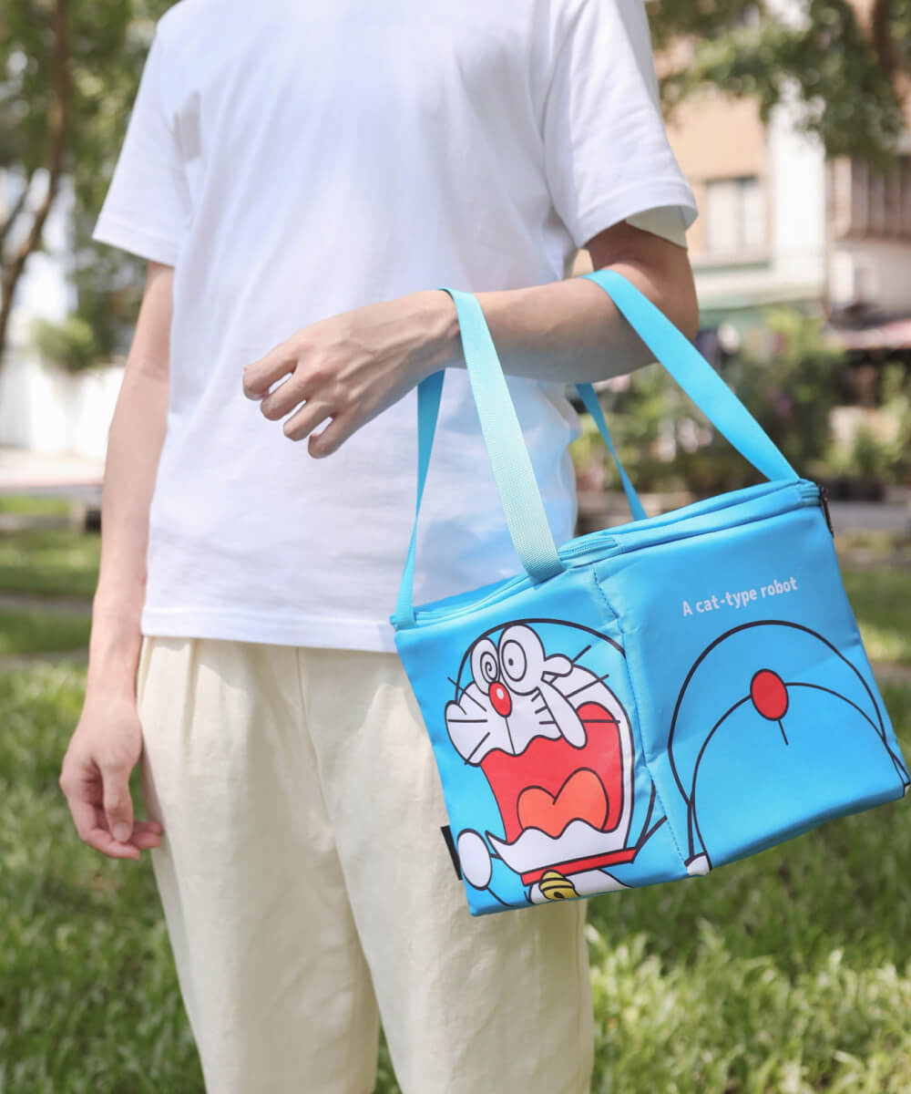 保冷袋四面是不同表情的哆啦A夢,受驚嚇的哆啦A夢表情很喜感。內部實用的保冷材質,底部還貼心附有鬆緊帶,使用後可壓縮收納,機能與設計兼具。