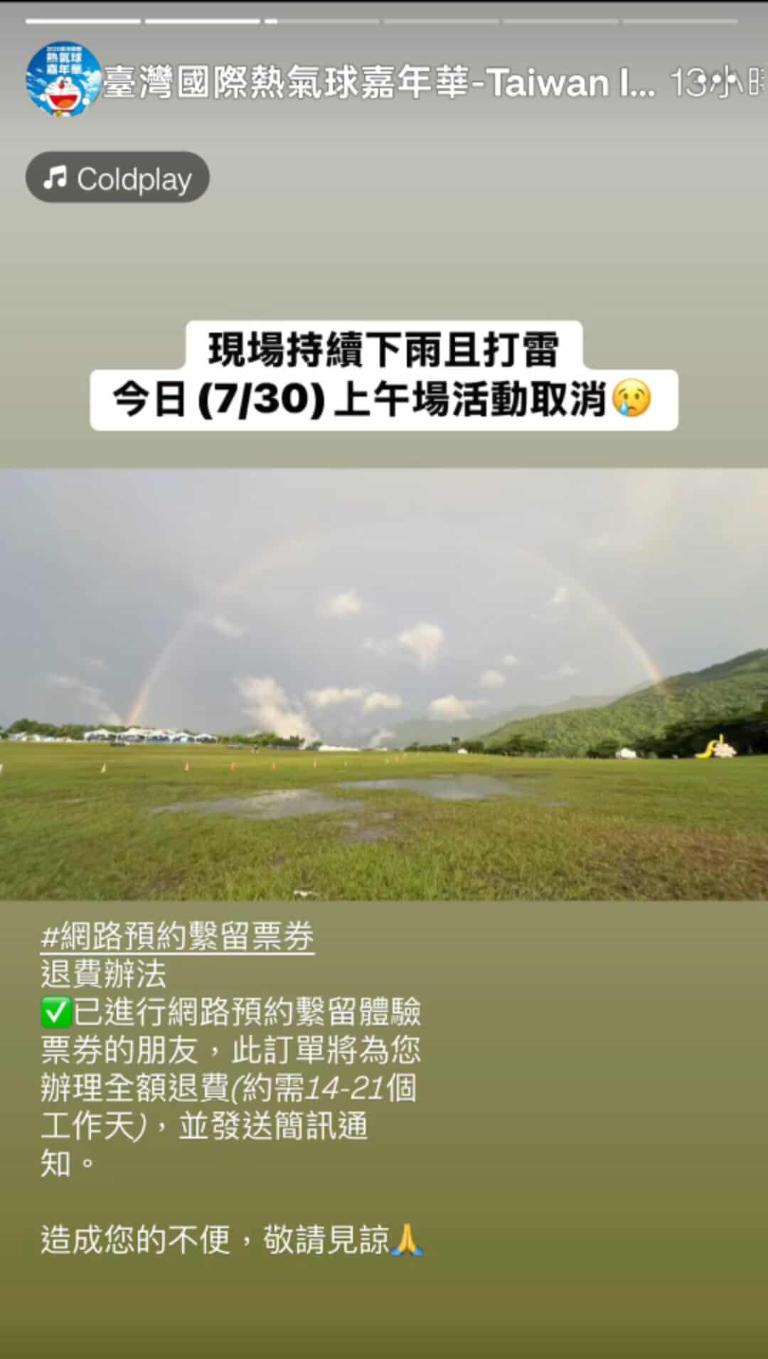 另外,7 月 30 日上午場經飛行指揮團隊評估,因鹿野高台持續下雨,透過限時動態發佈取消上午場活動,7 月 30 日活動全日取消。