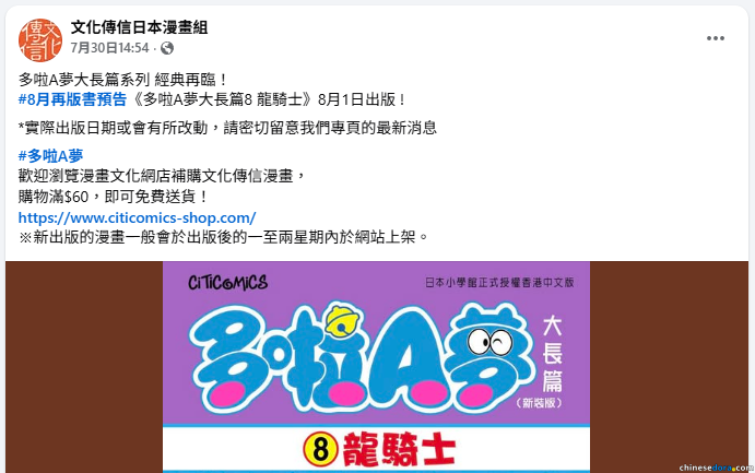 更多關於文化傳信推出的《多啦A夢》「香港中文版」漫畫書的販售通路等相關詳情,可參閱下列資訊。