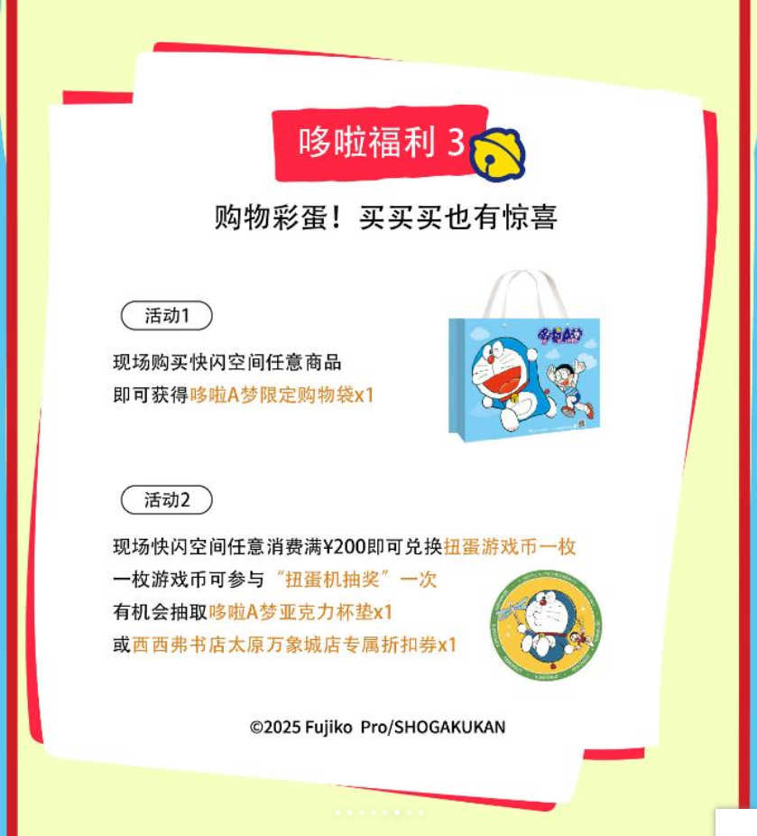 「漫畫哆啦A夢主題快閃店」還推出三種活動:哆啦福利1為完成任務步驟,即可至快閃店收銀區領取「藤子·F·不二雄博物館」哆啦A夢海報;哆啦福利2 為快閃限定印章挑戰,參與任務遊玩互動遊戲,現場任意消費,可獲得限定印章 1 枚,集滿三枚更可兌換完整套章!哆啦福利3為購買驚喜,只要任意消費即贈「哆啦A夢限定購物袋」一個,現場快閃店任意消費滿人民幣 200 元,即可獲得扭蛋代幣一枚,到扭蛋機開抽,有機會獲得限量「哆啦A夢壓克力杯墊」、「西西弗書店太原萬象城店」的專屬折扣券各一個。