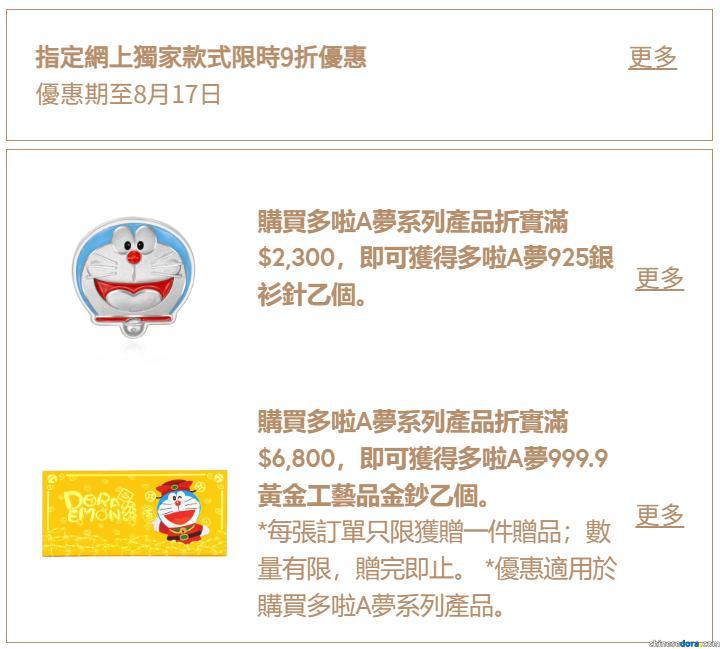 另外,消費滿指定金額更可獲贈精美禮品,其中多啦A夢系列滿港幣 2300 元可獲贈精選銀飾「多啦A夢 925 銀衫針」一個;滿港幣 6800 元可獲贈精選金鈔「多啦A夢 999.9 黃金工藝品金鈔」一件。每張訂單只限送一件贈品,數量有限,送完即止。詳情可參閱周大福網店。