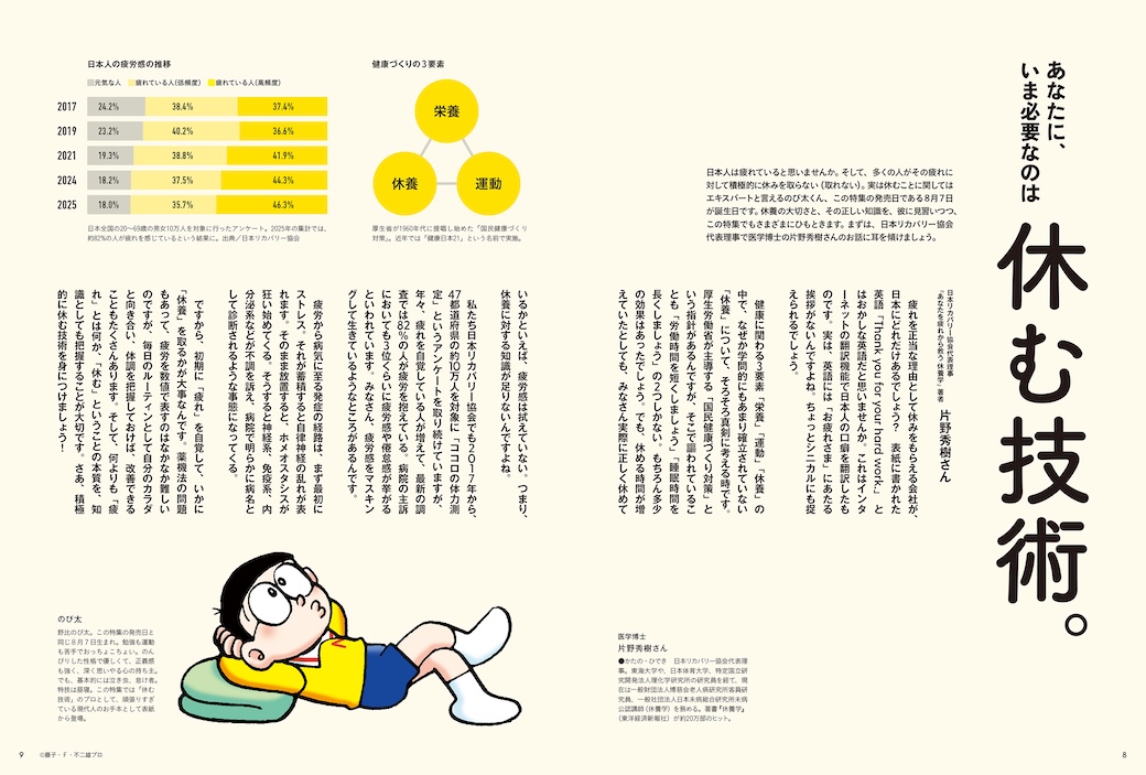 在特輯的開頭,大雄作為「休息專家(!?)」現身,並以超過 10 頁篇幅介紹他獨到的放鬆哲學。值得一提的是,8 月 7 日不只是雜誌發售日,同時也是大雄的生日!