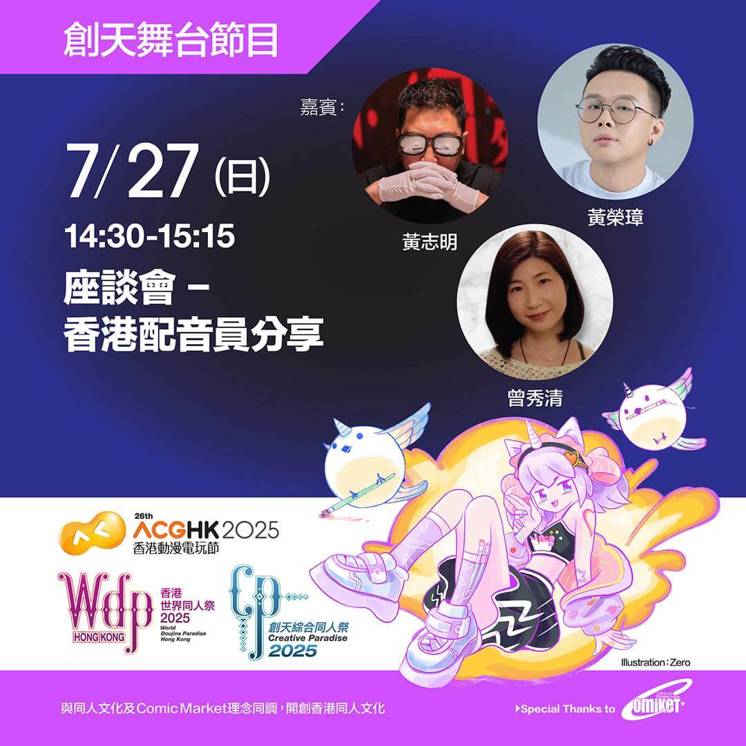 「香港動漫電玩節2025」的香港配音員分享環節在活動第三天(2025 年 7 月 27 日)舉行,邀請了三位現役香港配音員,包括現職 TVB 的曾秀清以及自由身配音員黃志明與黃榮璋。